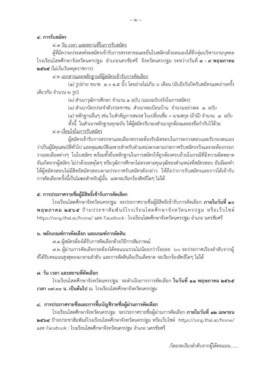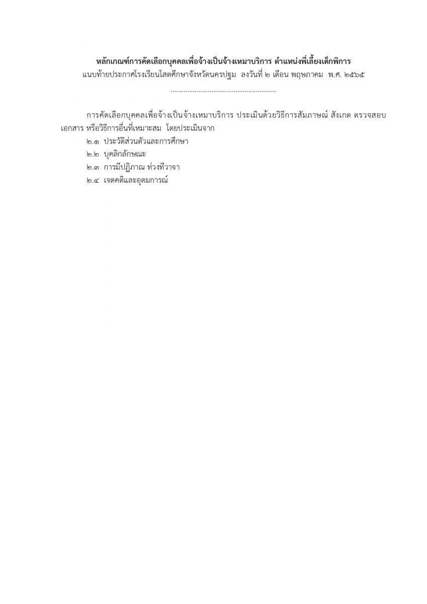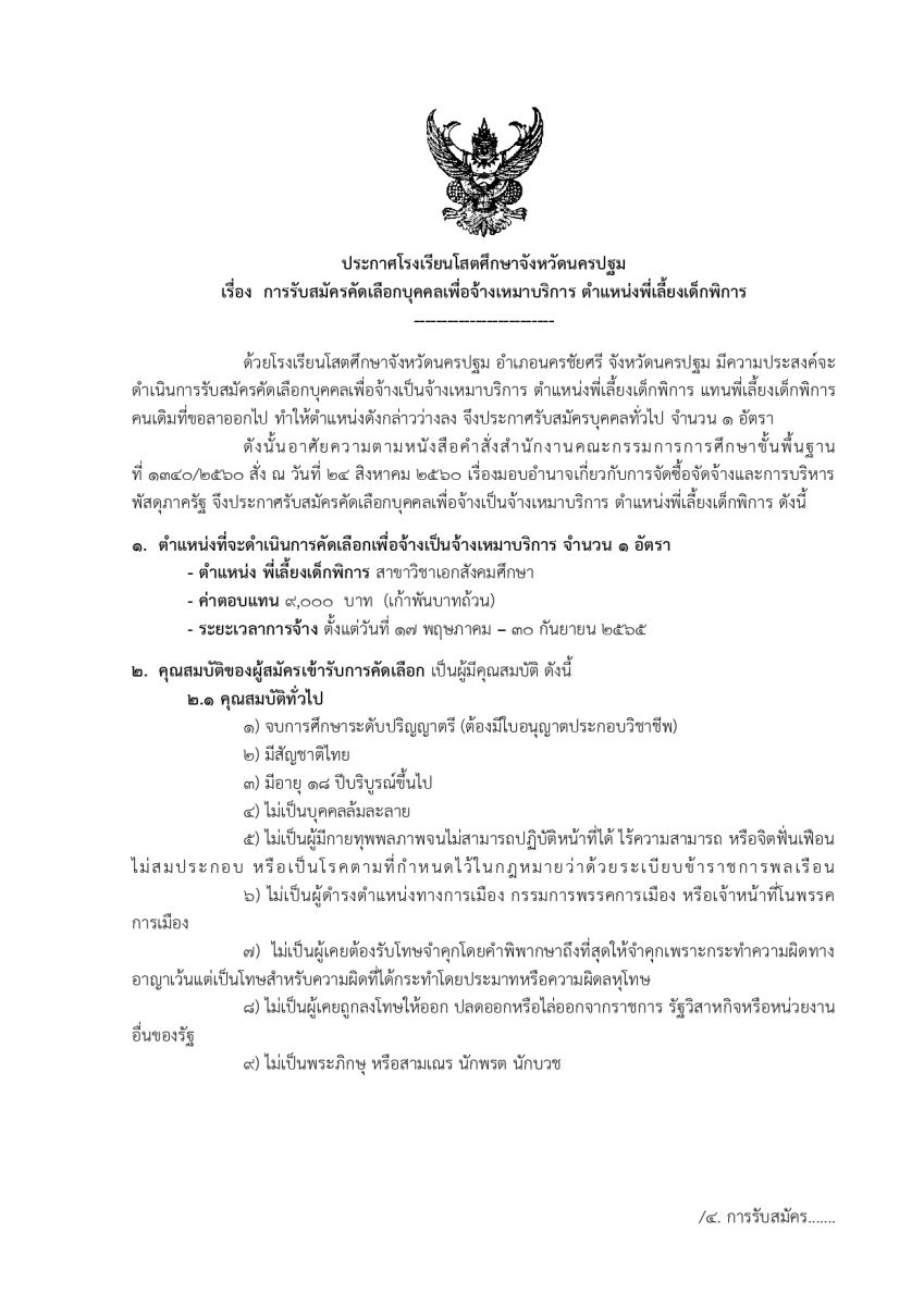 ด้วยโรงเรียนโสตศึกษาจังหวัดนครปฐม อำเภอนครชัยศรี จังหวัดนครปฐม มีความประสงค์จะดําเนินการรับสมัครคัดเลือกบุคคลเพื่อจ้างเป็นจ้างเหมาบริการ ตำแหน่งพี่เลี้ยงเด็กพิการ แทนพี่เลี้ยงเด็กพิการ คนเดิมที่ขอลาออกไป ทําให้ตําแหน่งดังกล่าวว่างลง จึงประกาศรับสมัครบุคคลทั่วไป จํานวน 1 อัตรา ตําแหน่ง พี่เลี้ยงเด็กพิการ สาขาวิชาเอกสังคมศึกษา (ต้องมีอนุญาตประกอบวิชาชีพ) ค่าตอบแทน 9,000 บาท (เก้าพันบาทถ้วน) ผู้ที่มีความประสงค์จะสมัครเข้ารับการสรรหาขอและยื่นใบสมัครด้วยตนเองได้ที่กลุ่มบริหารงานบุคคลโรงเรียนโสตศึกษาจังหวัดนครปฐม ระหว่างวันที่ 3 - 9 พฤษภาคม 2565 (ไม่เว้นวันหยุดราชการ)