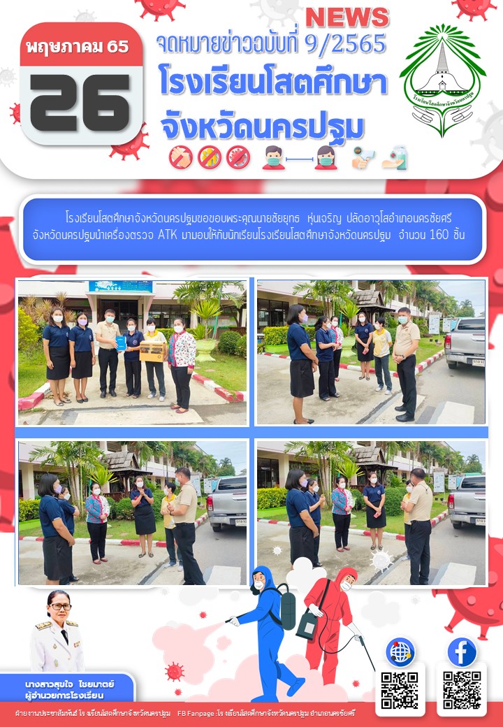 คุณนายชัยยุทธ หุ่นเจริญ ปลัดอาวุโสอำเภอนครชัยศรี จังหวัดนครปฐมนำเครื่องตรวจ ATK มามอบให้กับนักเรียนโรงเรียนโสตศึกษาจังหวัดนครปฐม