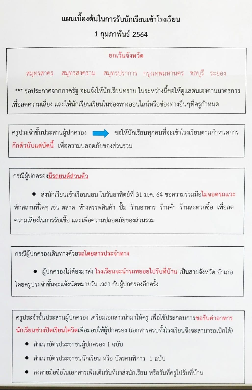 1 กุมภาพันธ์ 2564 ซึ่งขอให้ในช่วงเวลานี้ขอความกรุณาให้นักเรียนกักตัวเองอยู่บ้านตามมาตรการของกระทรวงสาธารณสุขอย่างเคร่งครัดก่อนเดินทางมาเข้าเรียนโดยผู้กครองและนักเรียนโปรดศึกษาทำความเข้าใจแผนเบื้องต้นในการรับนักเรียนเข้าโรงเรียนดังนี้...หากมีข้อสงสัยประการใดสอบถามได้ที่ครูประจำชั้นของนักเรียนได้ครับ