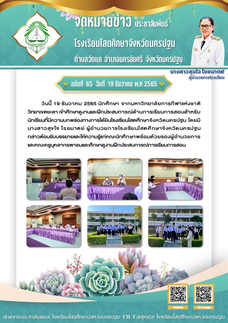วันนี้ 19 ธันวาคม 2565 นักศึกษา จากมหาวิทยาลัยการกีฬาแห่งชาติ วิทยาเขตยะลา เข้าศึกษาดูงานและฝึกประสบการณ์ด้านการเรียนการสอนสำหรับนักเรียนที่มีความบกพร่องทางการได้ยินโรงเรียนโสตศึกษาจังหวัดนครปฐม
