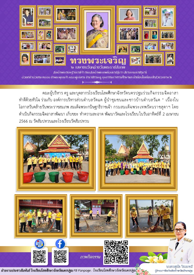 เนื่องในโอกาสวันคล้ายวันพระราชสมภพ สมเด็จพระกนิษฐาธิราชเจ้า กรมสมเด็จพระเทพรัตนราชสุดาฯ โดยดำเนินกิจกรรมจิตอาสาพัฒนา เก็บขยะ ทำความสะอาด พัฒนาวัดและโรงเรียน