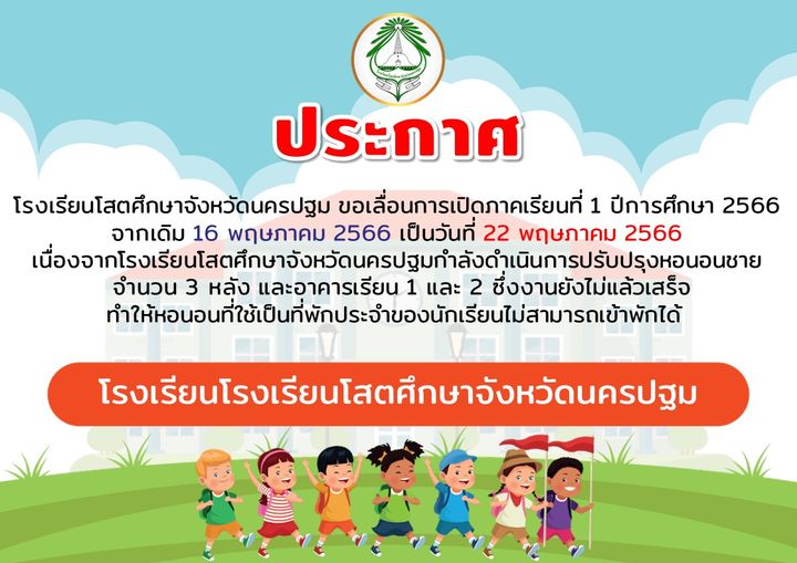 ประกาศ โรงเรียนโสตศึกษาจังหวัดนครปฐม ขอเลื่อนการเปิดภาคเรียนที่ 1 ปีการศึกษา 2566 จากเดิม 16 พฤษภาคม 2566 เป็นวันที่ 22 พฤษภาคม 2566 เนื่องจากโรงเรียนโสตศึกษาจังหวัดนครปฐมกำลังดำเนินการปรับปรุงหอนอนชา