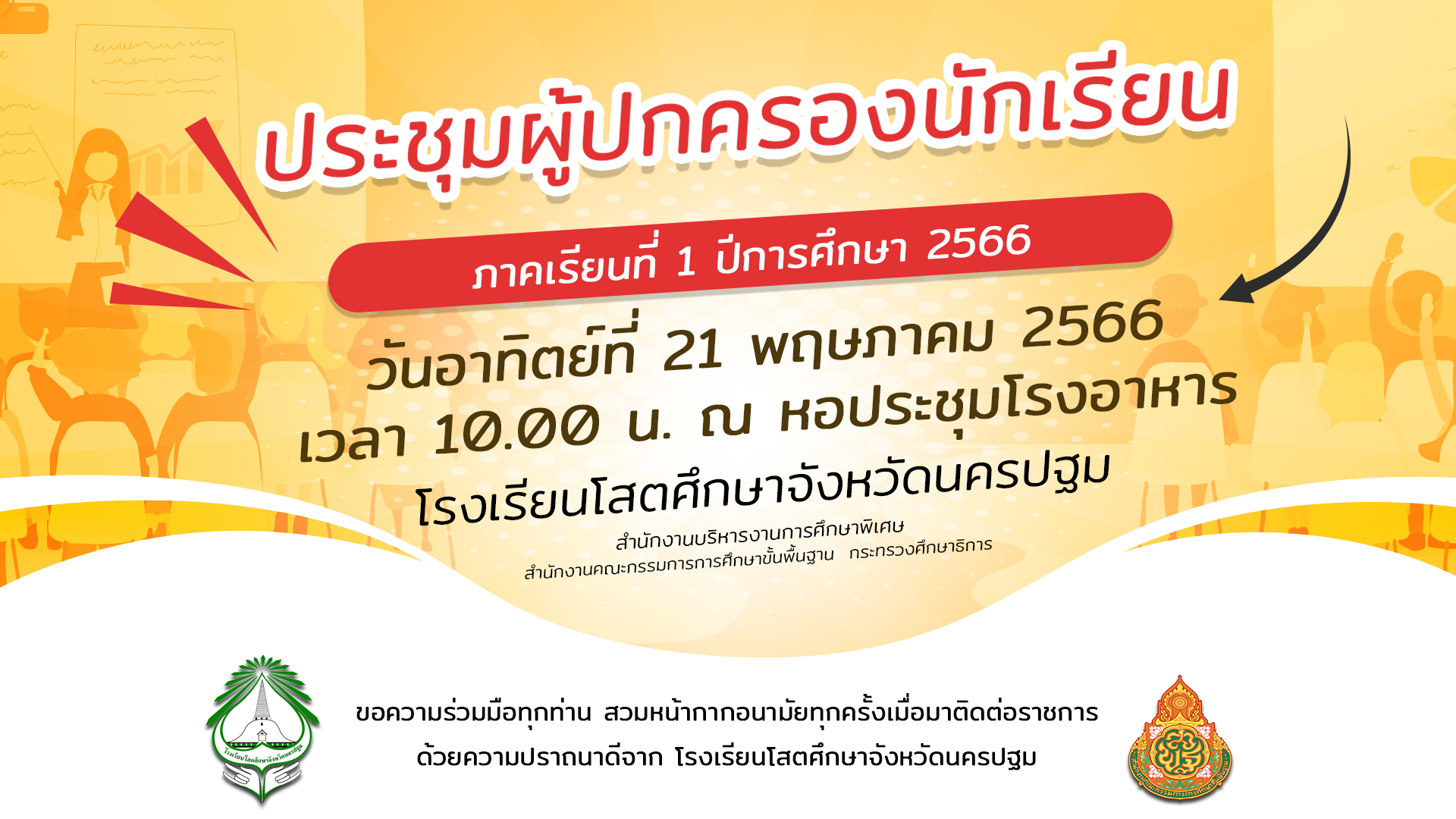 ประชุมผู้ปกครองนักเรียน ภาคเรียนที่ 1 ปีการศึกษา 2566 วันอาทิตย์ 21 พฤษภาคม 2566 เวลา 10.00 น. ณ หอประชุมโรงอาหาร โรงเรียนโสตศึกษาจังหวัดนครปฐม