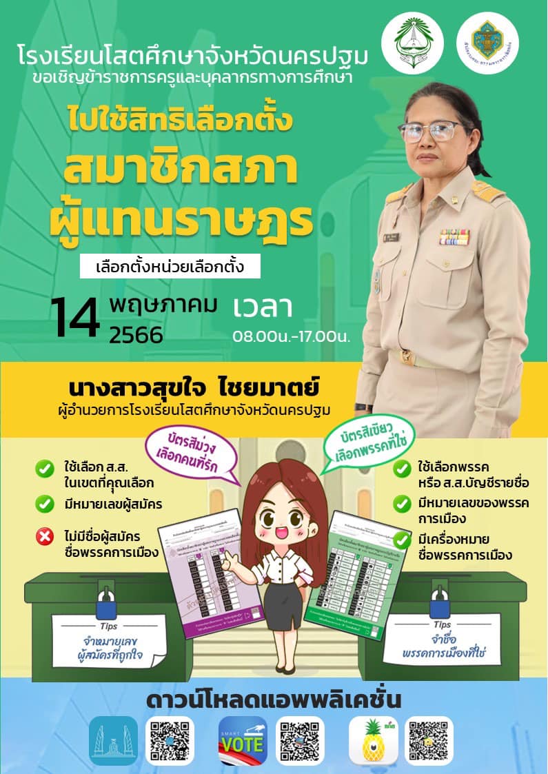 โรงเรียนโสตศึกษาจังหวัดนครปฐม ขอเชิญข้าราชการครูและบุคลากรทางการศึกษา ไปใช้สิทธิเลือกตั้ง สมาชิกสภา ผู้แทนราษฎร ใน วันที่ 14 พฤษภาคม 2566 เวลา 08.00น.-17.00น.