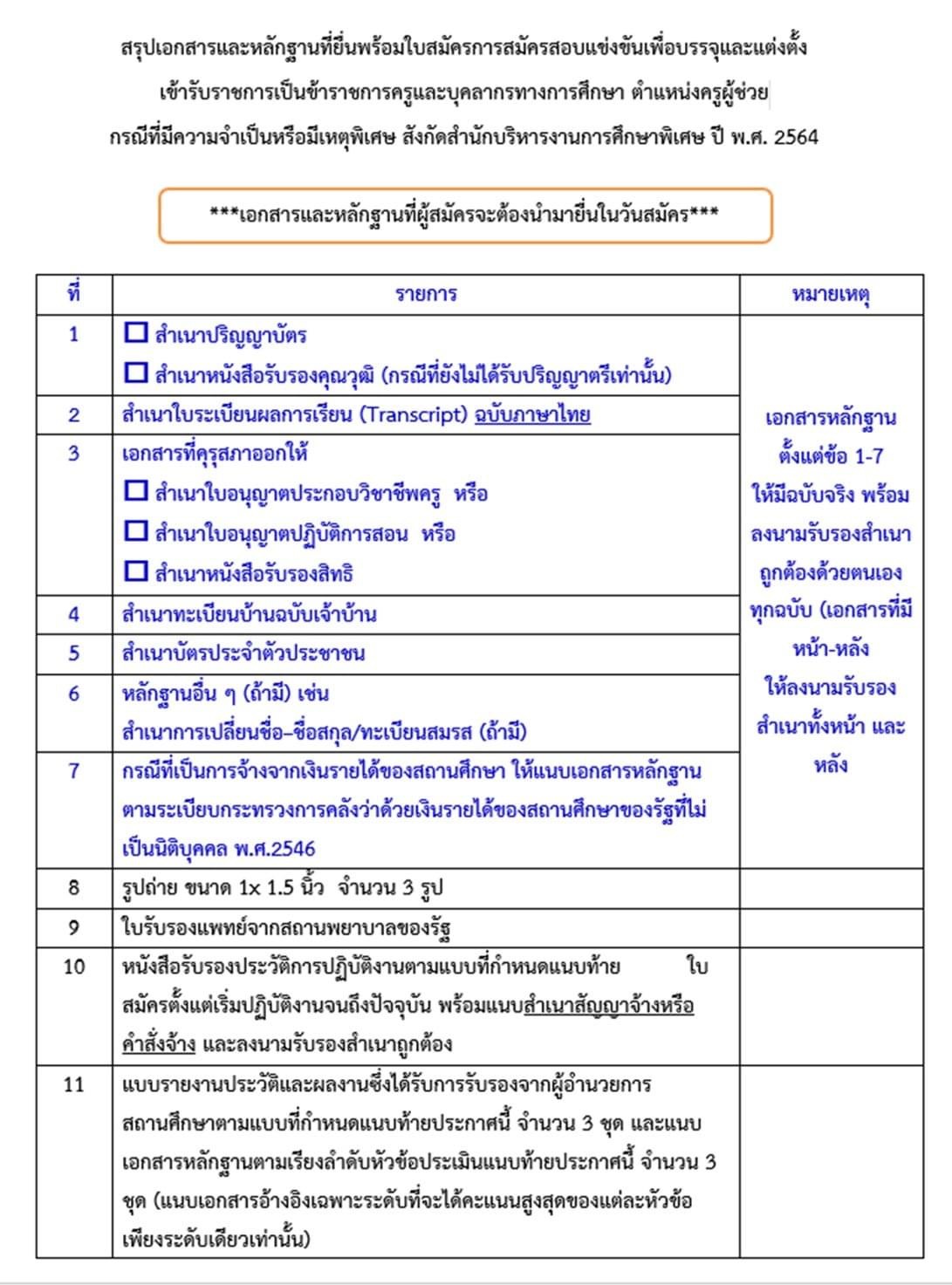 เพื่อความถูกกต้อง/สะดวก/รวดเร็ว /แจ้งผู้ที่จะเดินทางมาสมัครสอบแข่งขันให้เตรียมเอกสารหลักฐานให้ครบถ้วน/เอกสารฉบับที่มีทั้งสองหน้าให้สำเนาเอกสารมาทั้งสองหน้าและลงลายมือชื่อสำเนาถูกต้องทุกหน้า