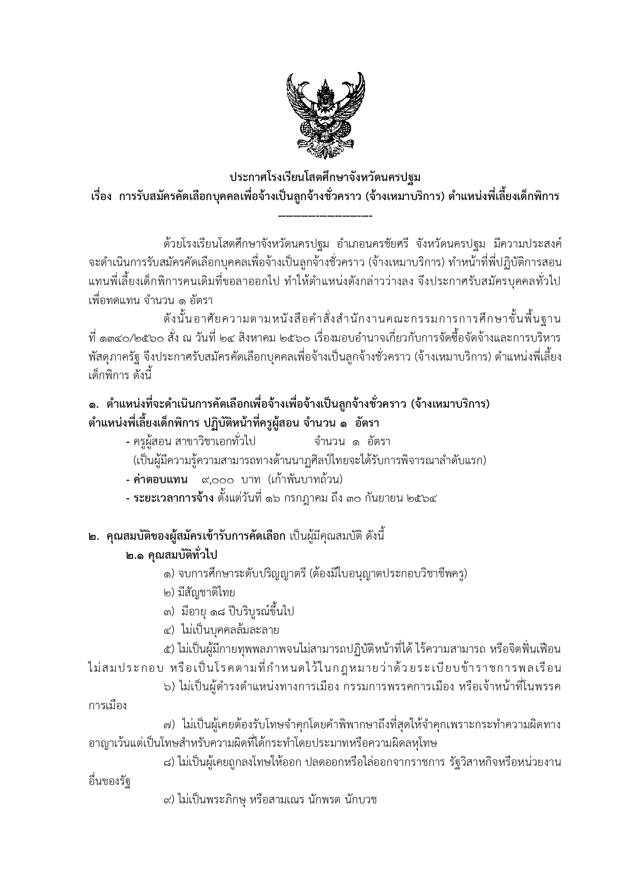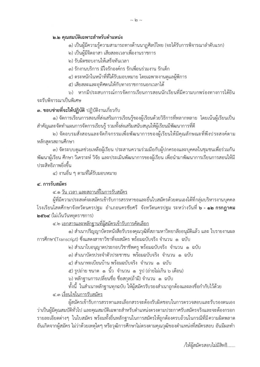 ด้วยโรงเรียนโสตศึกษาจังหวัดนครปฐม  อำเภอนครชัยศรี  จังหวัดนครปฐม  มีความประสงค์จะดําเนินการรับสมัครคัดเลือกบุคคลเพื่อจ้างเป็นลูกจ้างชั่วคราว (จ้างเหมาบริการ) ปฏิบัติหน้าที่ครูผู้สอน สาขาวิชาเอกทั่วไป (มีความรู้ความสามารถด้านนาฏศิลป์ไทยจะได้รับการพิจารณาลำดับแรก) จํานวน 1 อัตรา ผู้ที่มีความประสงค์จะสมัครเข้ารับการสรรหาขอและยื่นใบสมัครด้วยตนเองได้ที่กลุ่มบริหารงานบุคคลโรงเรียนโสตศึกษาจังหวัดนครปฐม  อำเภอนครชัยศรี  จังหวัดนครปฐม ระหว่างวันที่ 6 - 12 กรกฎาคม 2564 (ไม่เว้นวันหยุดราชการ) และรายละเอียดดังเอกสารที่แนบท้ายประกาศนี้