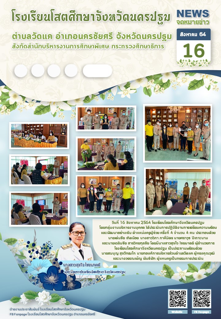 วันที่ 16 สิงหาคม 2564 โรงเรียนโสตศึกษาจังหวัดนครปฐม โดยกลุ่มงานบริหารงานบุคคล ได้ประเมินการปฏิบัติงานการเตรียมความพร้อมและพัฒนาอย่างเข้ม ตำแหน่งครูผู้ช่วย ครั้งที่ 4 จำนวน 4 คน ประกอบด้วย นายเดชชัย เกิดน้อย นางสาววิภา ภาคีมิตร นายศราวุธ ปิเถาะนามและนายเฉลิมชัย สารวิทยกุลชัย โดยมีนางสาวสุขใจ ไชยมาตย์ ผู้อำนวยการโรงเรียนโสตศึกษาจังหวัดนครปฐม เป็นประธานพร้อมด้วย นายสมบุญ สุขวัฑฒโก นายกองค์การบริหารส่วนตำบลวัดแค ผู้ทรงคุณวุฒิ และนางสาววรรณเพ็ญ พันธ์ฟัก ผู้แทนครู เป็นกรรมการประเมิน