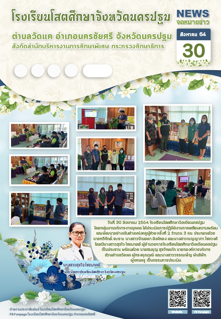 วันที่ 30 สิงหาคม 2564 โรงเรียนโสตศึกษาจังหวัดนครปฐม โดยกลุ่มงานบริหารงานบุคคล ได้ประเมินการปฏิบัติงานการเตรียมความพร้อมและพัฒนาอย่างเข้ม ตำแหน่งครูผู้ช่วย ครั้งที่ 2จำนวน 3 คน ประกอบด้วย นายทวีศักดิ์ ชะเราะ นางสาวปัณยตา สิงห์ทอง และนางสาวเบญญาภา ไชยวงศ์ โดยมีนางสาวสุขใจ ไชยมาตย์ ผู้อำนวยการโรงเรียนโสตศึกษาจังหวัดนครปฐม เป็นประธานพร้อมด้วย