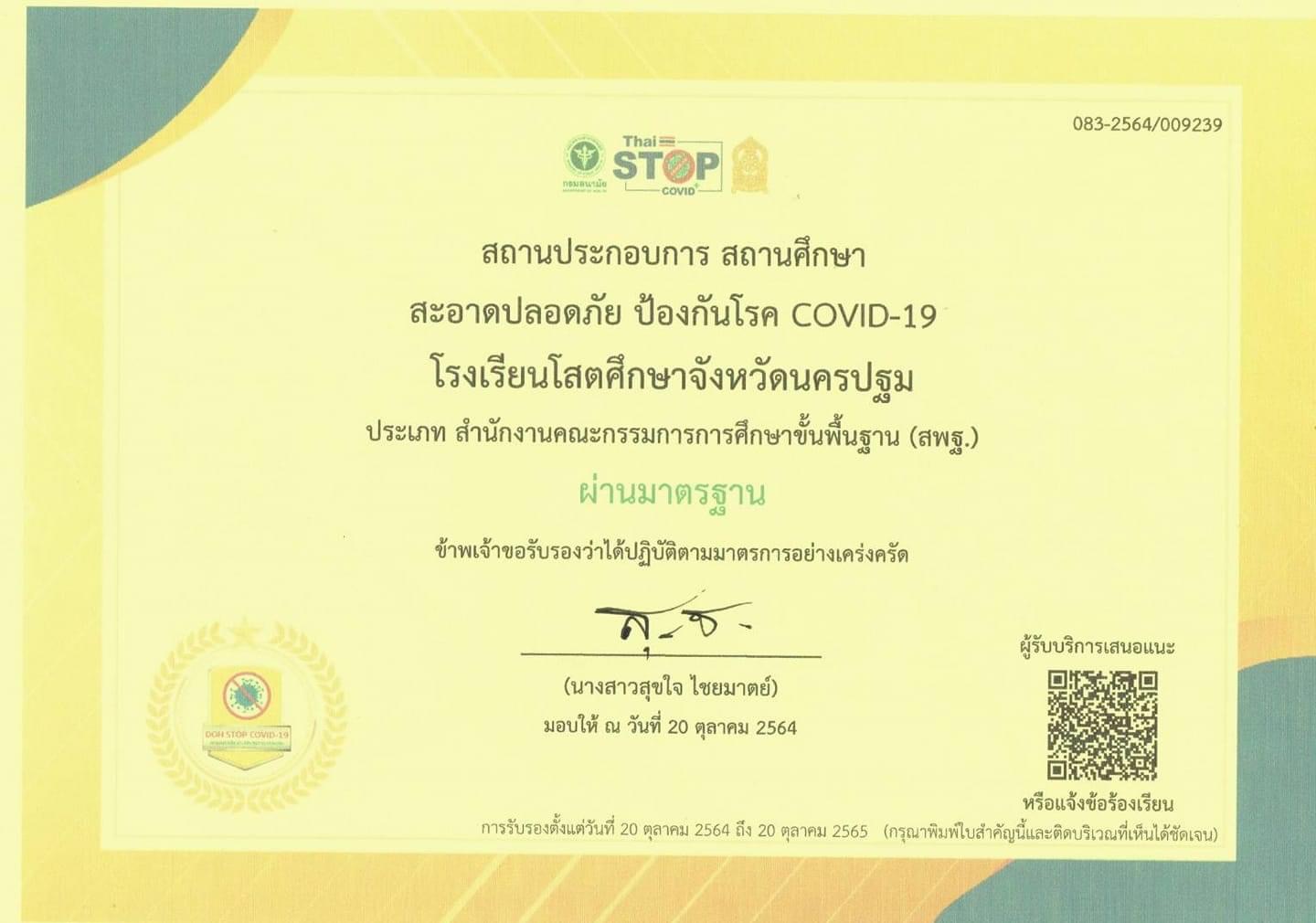 ประกาศโรงเรียนโสตศึกษาจังหวัดนครปฐมผ่านเกณฑ์การประเมินความพร้อมเปิดเรียนของสถานศึกษา  ได้รับการรับรองว่า ผ่านมาตรฐาน สถานประกอบการ สถานศึกษาสะอาดปลอดภัย ป้องกันโรค COVID-19  ประเภท สำนักงานคณะกรรมการการศึกษาขั้นพื้นฐาน (สพฐ.) ผ่านระบบ Thai Stop Covid Plus (TSC+) กรมอนามัย ตามแนวทาง 7 มาตรการเข้มสำหรับสถานศึกษา รองรับการเปิดภาคการศึกษาที่ 2/2564