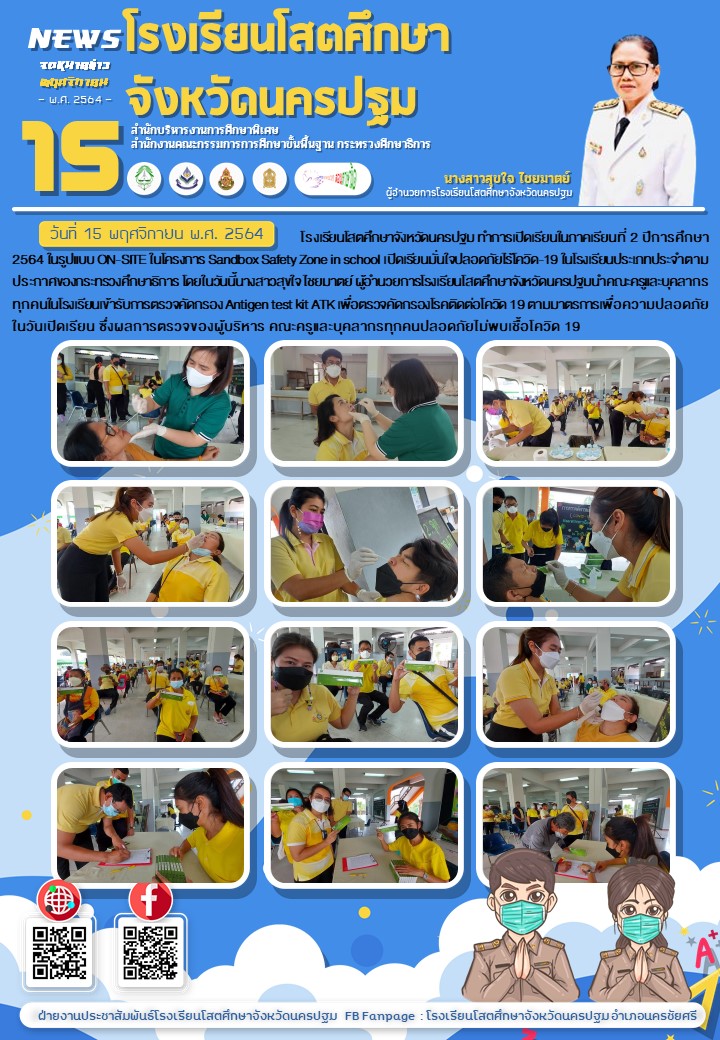 วันที่ 15 พฤศจิกายน 2564 โรงเรียนโสตศึกษาจังหวัดนครปฐม ทำการเปิดเรียนในภาคเรียนที่ 2 ปีการศึกษา 2564 ในรูปแบบ ON-SITE ในโครงการ Sandbox Safety Zone in school เปิดเรียนมั่นใจปลอดภัยไร้โควิด-19 ในโรงเรียนประเภทประจำตามประกาศของกระทรวงศึกษาธิการ โดยในวันนี้นางสาวสุขใจ ไชยมาตย์ ผู้อำนวยการโรงเรียนโสตศึกษาจังหวัดนครปฐมนำคณะครูและบุคลากรทุกคนในโรงเรียนเข้ารับการตรวจคัดกรอง Antigen test kit ATK เพื่อตรวจคัดกรองโรคติดต่อโควิด 19 ตามมาตรการเพื่อความปลอดภัยในวันเปิดเรียน ซึ่งผลการตรวจของผู้บริหาร คณะครูและบุคลากรทุกคนปลอดภัยไม่พบเชื้อโควิด 19